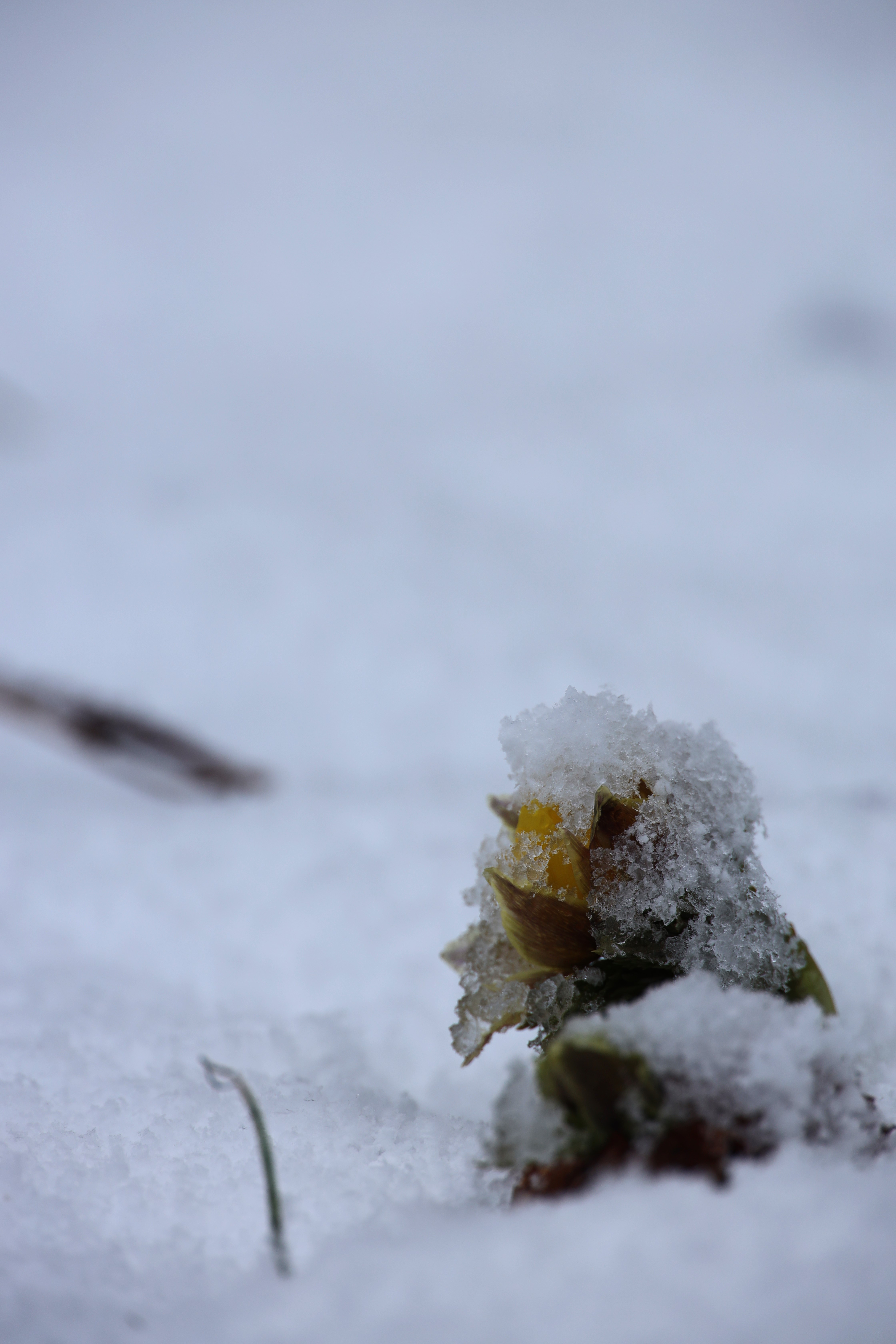 雪のちくもり予報を期待し、福寿草の撮影に出かけました。