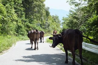 昨日、クルマユリを見つけましたが撮影を忘れてしまいドンデン高原に再度行ってきました。途中思いがけない一行に遭遇。突然のことに驚いてシャッターを切る事を忘れ唖然と見送ってしまいました。県道に牛が・・・慌てて車をUターンさせ失礼ながら後ろからガシャ。(すべて女子牛たちとのこと)ちょうどお昼時、県道脇の草を食べ歩いていました。
