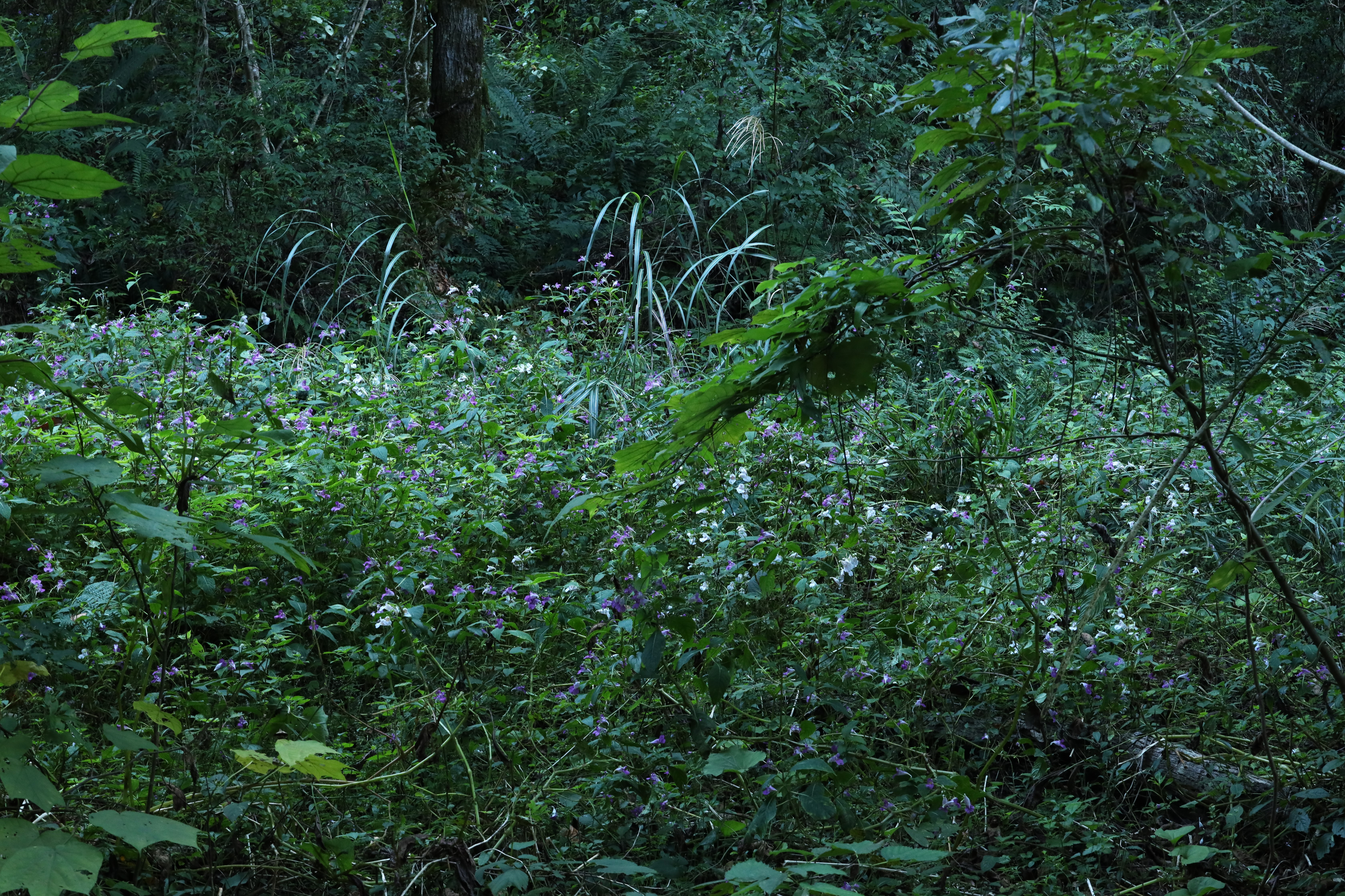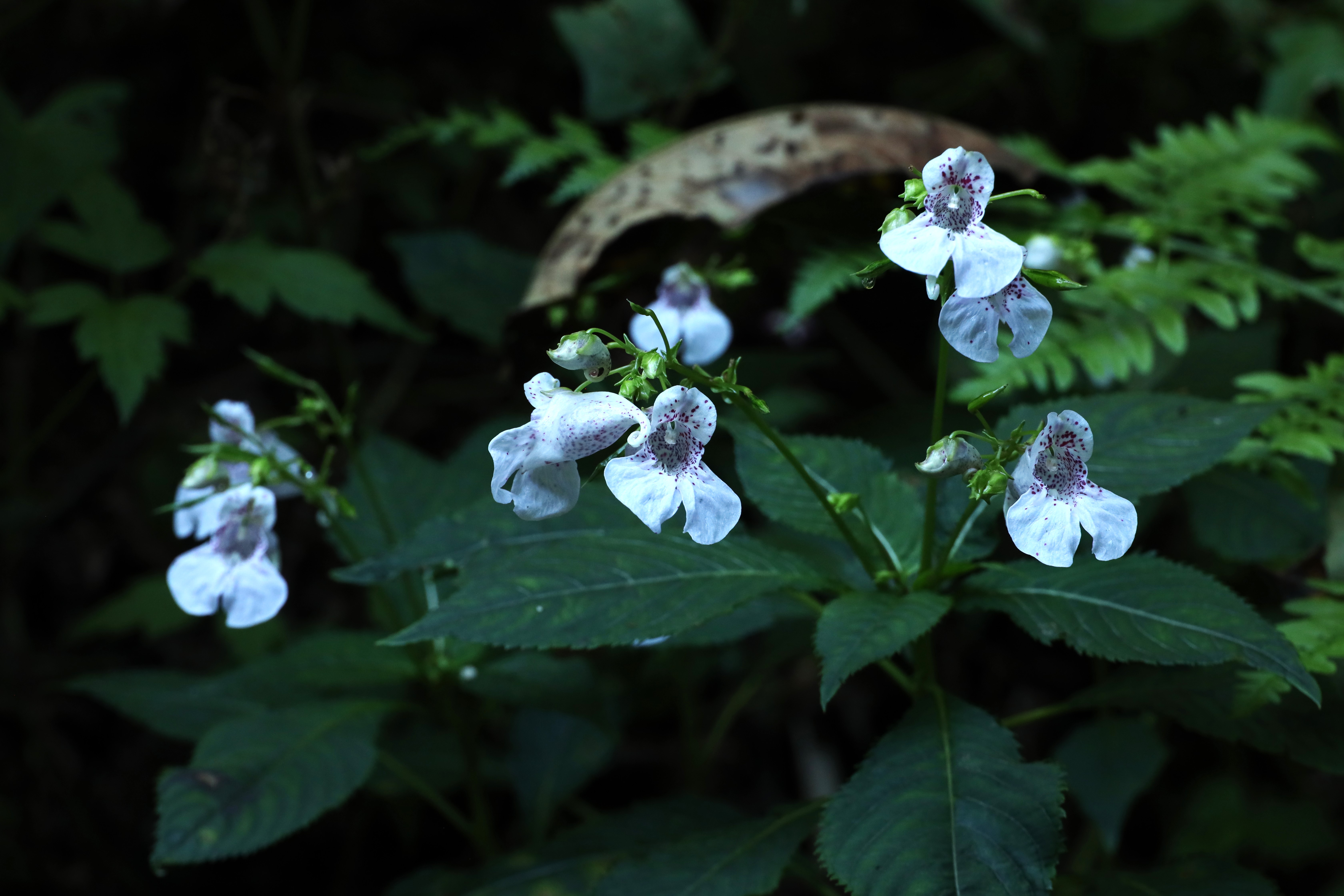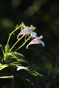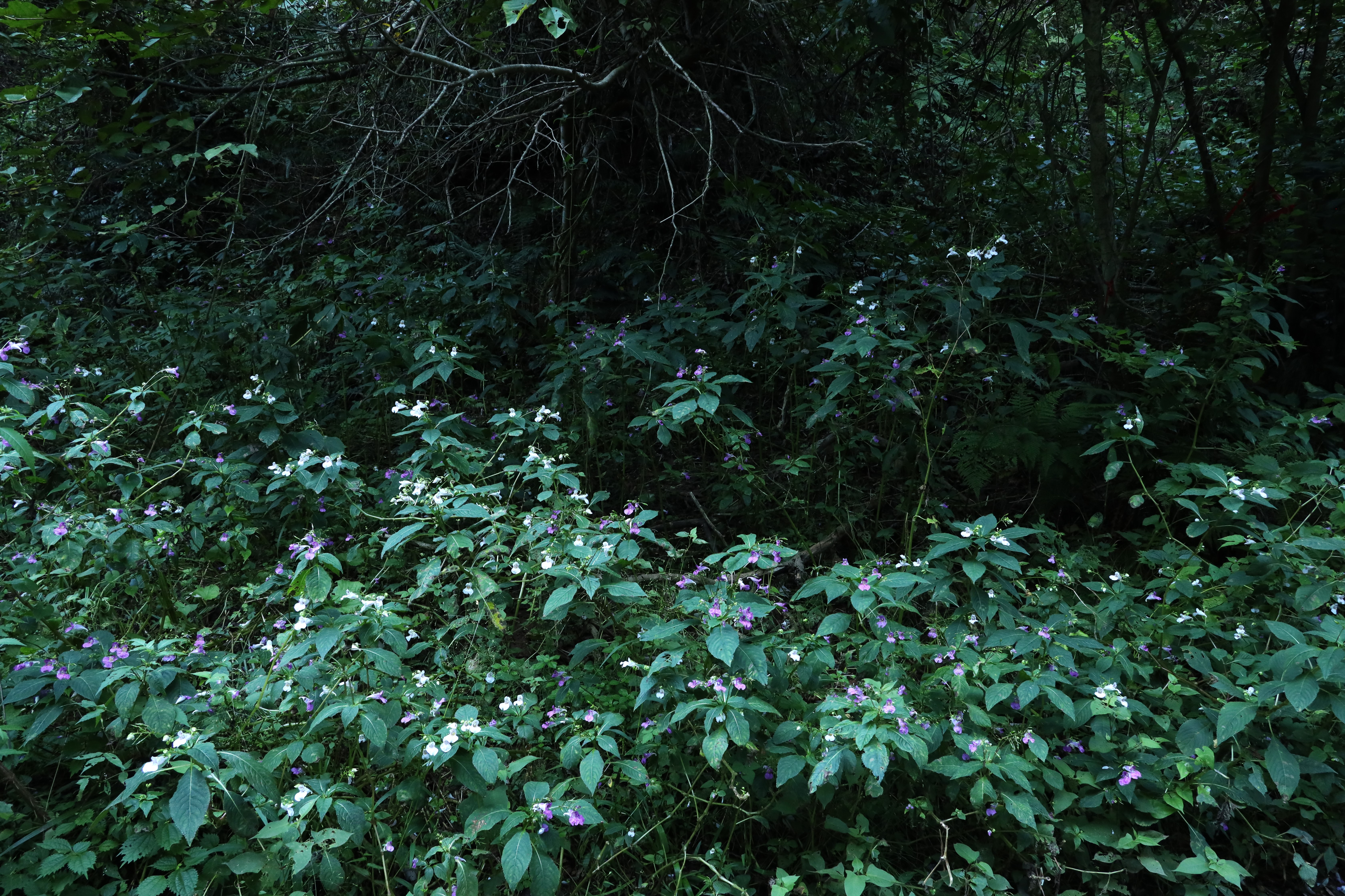 今日の撮影地は、シロと通常の濃いツリフネソウが群生しています。