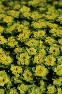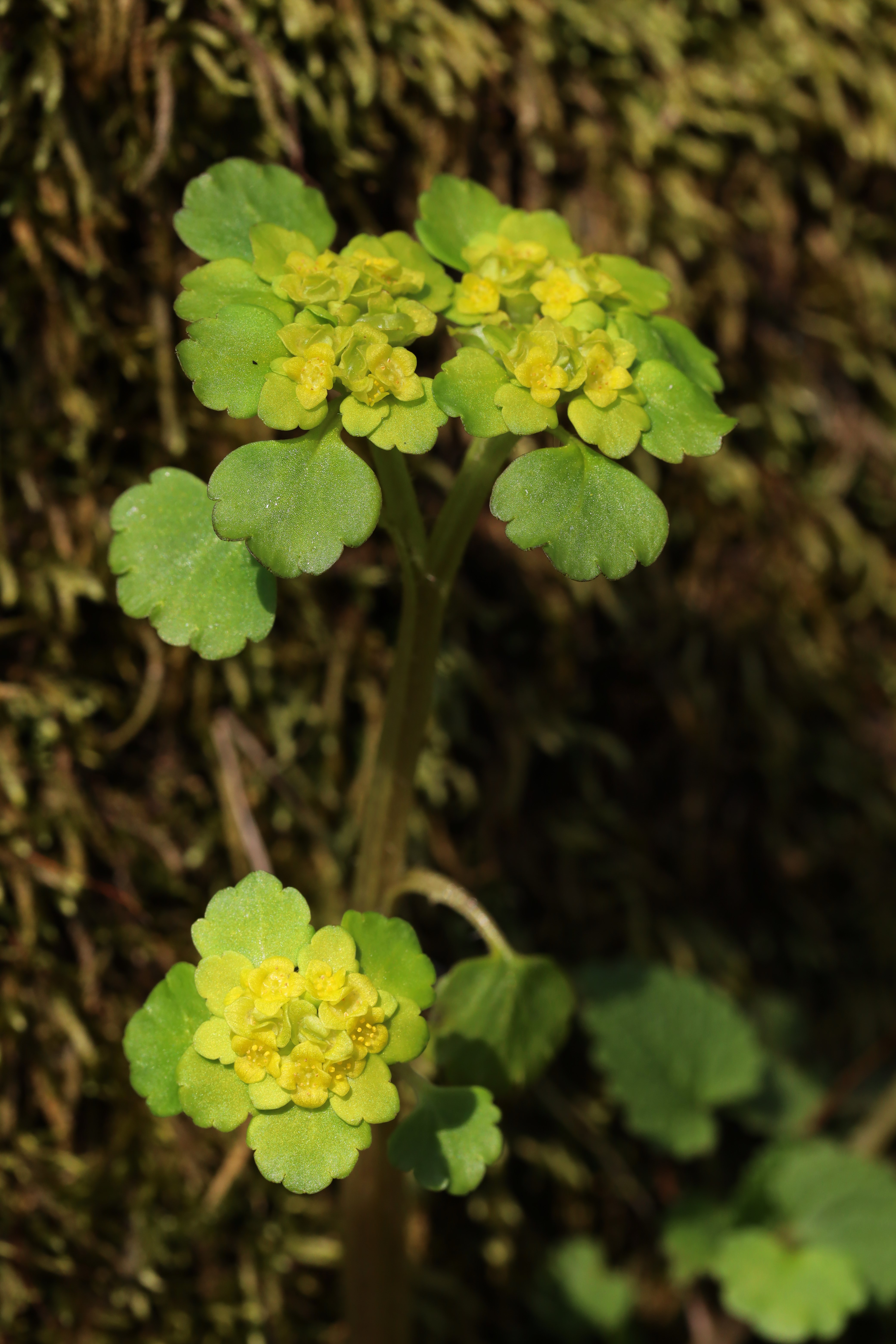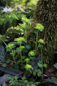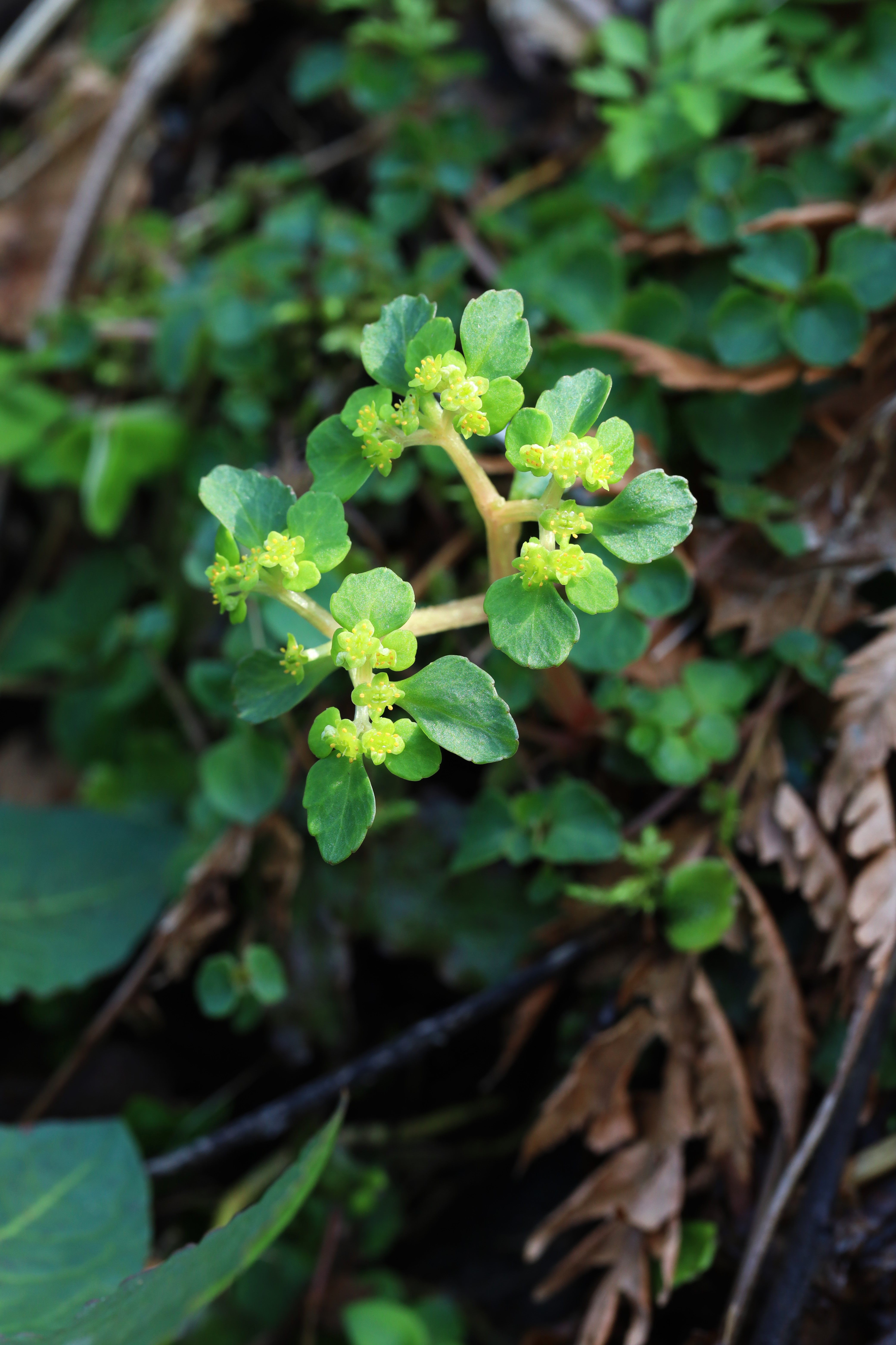 チシマヤマネコノメソウの花序を取り囲む苞葉は、卵形から円形で、先端は円形、基部はくさび形